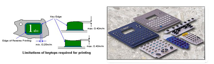 : 可應用多種顏色印刷與多種印刷方式, 每一色需單一印刷程序. 此為平面印刷中效果最佳者, 部分圓弧表面按鍵可參考以下方式: